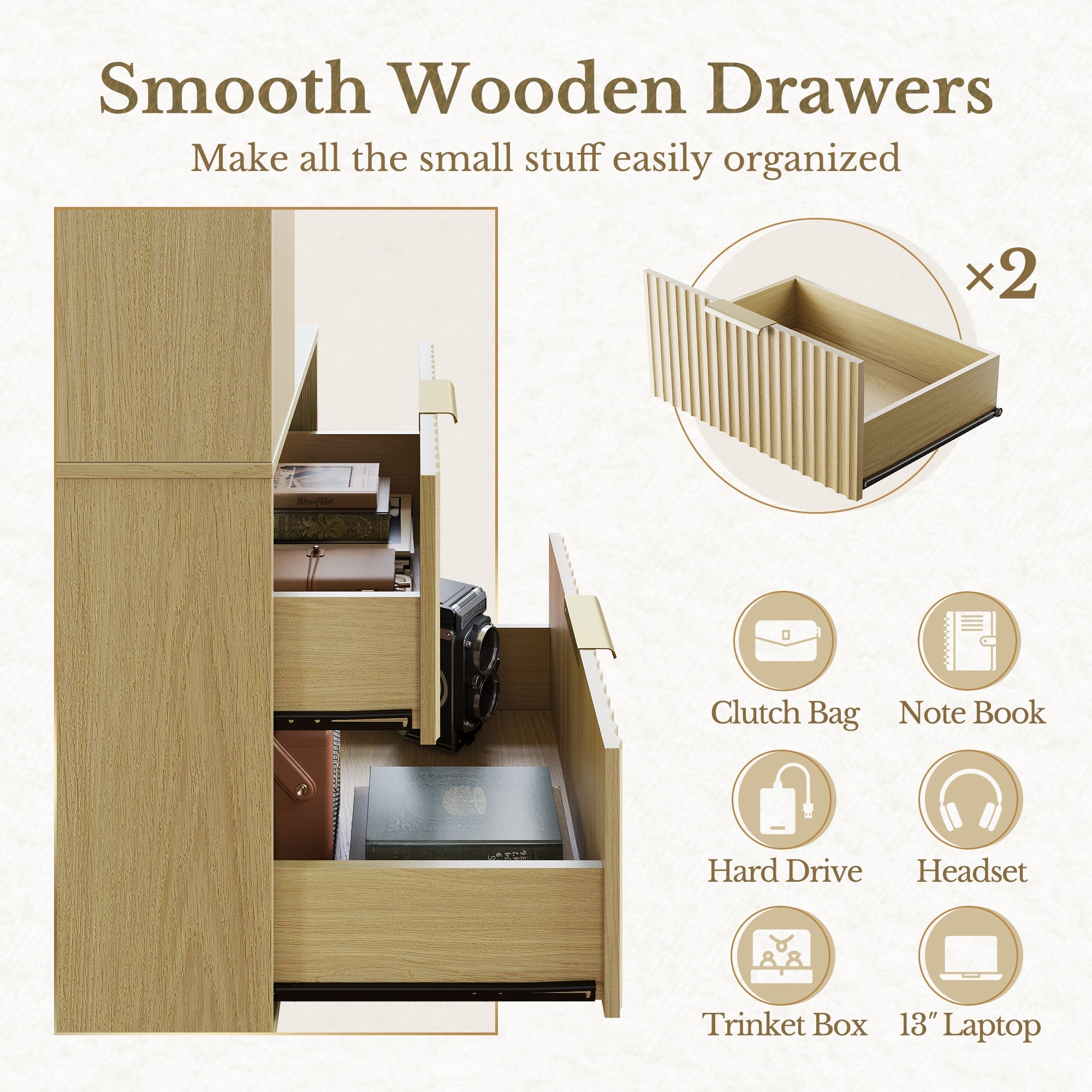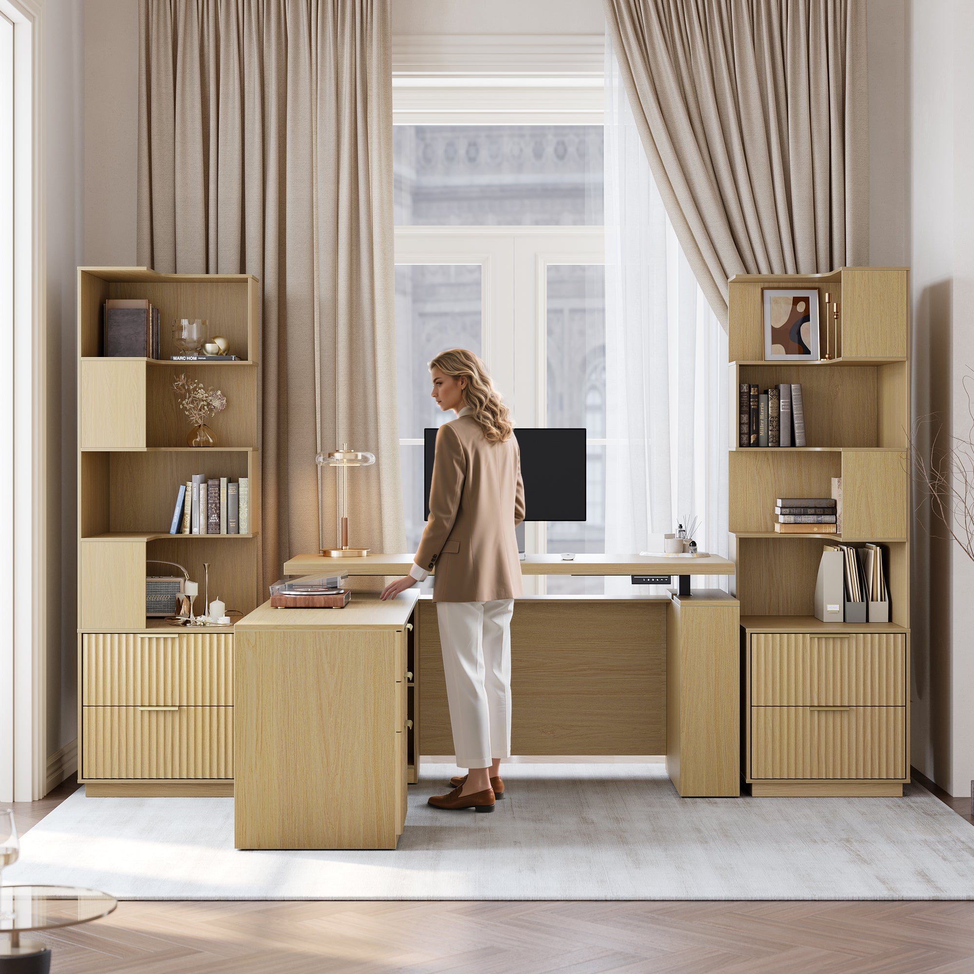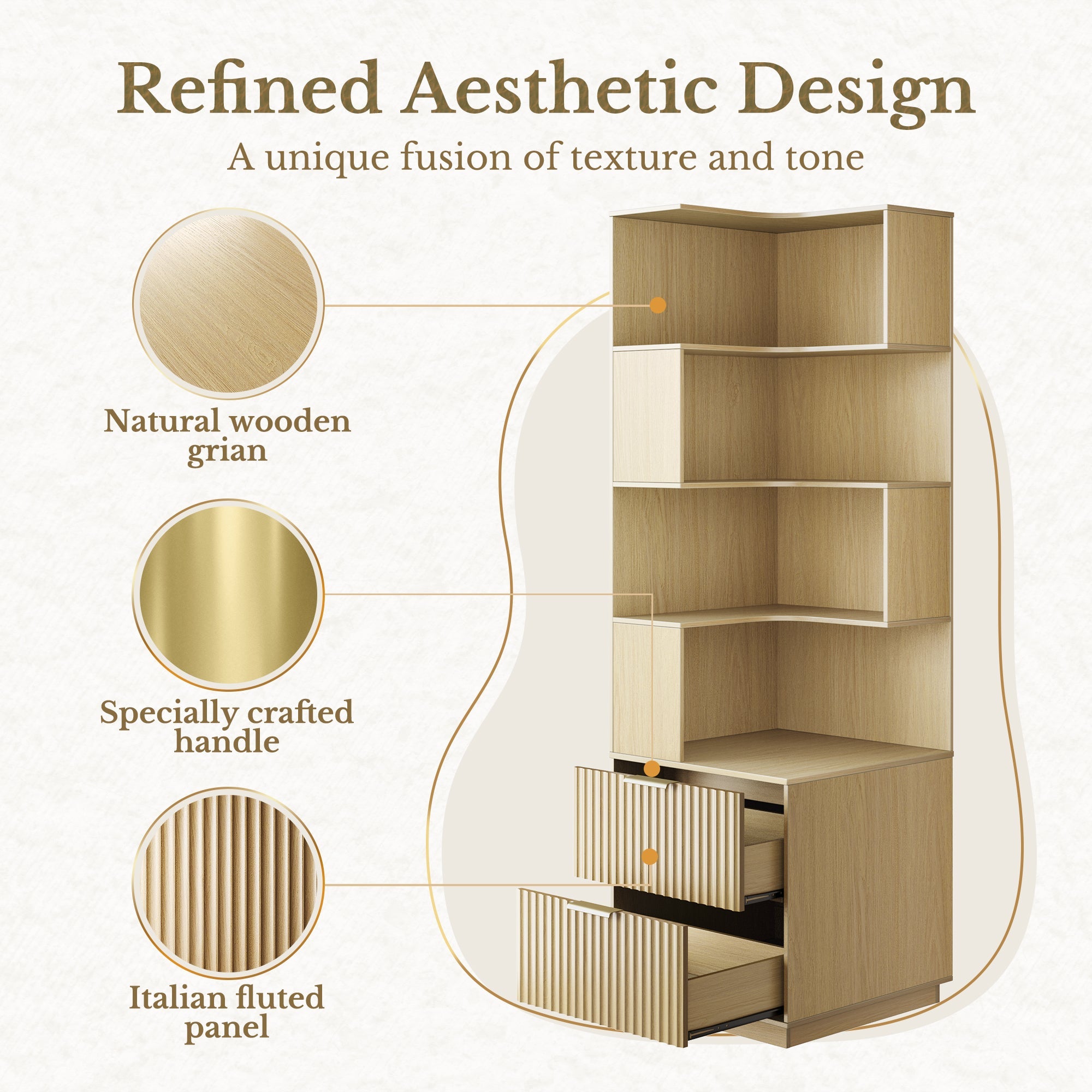 This bookshelf features a refined aesthetic with natural wood grain panels, Italian fluted drawer fronts, and specially crafted golden handles. The thoughtful fusion of texture and tone adds a touch of elegance and modernity, making it a standout piece in any room.