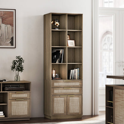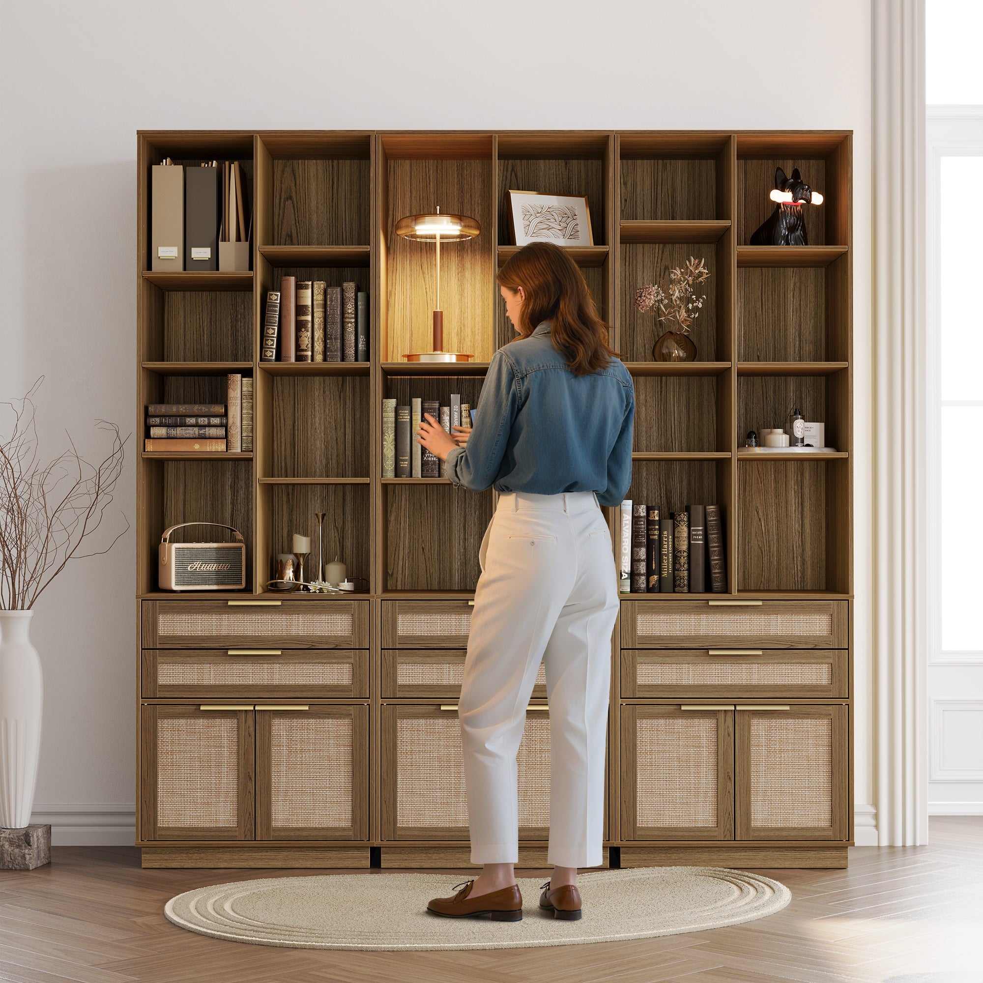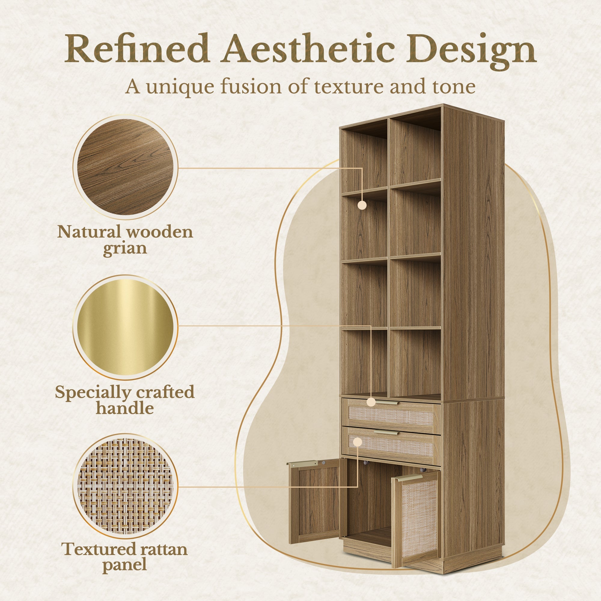 A curated blend of natural textures and refined finishes—smooth wood grain, vertical fluted panels, and a brushed gold handle come together to create a bookshelf that feels as beautiful as it is functional. Subtle luxury, made for modern living.